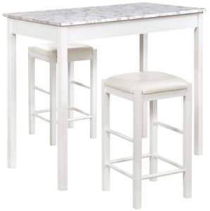 3 piece counter set with space saving convenience. This set features a elegant rectangular table on long sturdy legs with two backless counter height stools with padded, black faux leather upholstered seats. Made from solid woods and a faux marble top.Read More